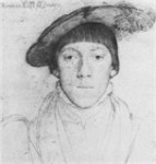 Frances de Vere was the daughter of John de Vere, 15th earl of Oxford (1490-March 21,1540) and Elizabeth Trussell (1496-c.1527). She had no fortune, but in April 1532, she married Henry Howard, earl of Surrey (1517-x.January 19,1547). They lived apart until 1535 because of their youth. Alison Weir in Henry VIII: The King and his Court, states that Anne Boleyn arranged the match over the objections of the duchess of Norfolk and that Frances was at court as one of Anne’s ladies from 1533. She was also at court when Catherine Howard was queen, but not, apparently, afterward. Catherine gave her a brooch set with tiny diamonds and rubies. According to one of her grandson’s biographers, Frances, in common with her more famous husband, wrote poetry. Her children were clever and well educated, although Frances did not have charge of their education. They were Jane (1537?-1593), Thomas (March 10, 1538-June 2,1572), Catherine (1539?-April 7,1596), Henry (February 1540-1614), and Margaret (January 1543-March 17,1592). Frances miscarried in 1547, the year her husband was executed for treason. She was ill for some time afterward. Alternatively, Robert Hutchinson in House of Treason states that Frances gave birth to daughter Jane three weeks after Surrey was executed and names Catherine as the eldest daughter. W. A. Sessions in Henry Howard The Poet Earl of Surrey gives the birth order as Thomas (March 12, 1536), Henry (February 25, 1538), Jane, Catherine, and Margaret (1547). By 1553, Frances had married Thomas Steyning of Woodbridge, Suffolk (d. October 20, 1575+), where she owned the manor of East Soham near Framlingham Castle. She was granted nine manors in all by the duke of Norfolk, her father-in-law, after his restoration in 1553. In July 1554, Frances represented Queen Mary at the christening of the French ambassador’s son and in December 1557 she was chief mourner at the funeral of her sister-in-law, Mary Howard. She was also chief mourner for her daughter-in-law, Margaret Audley, on January 17, 1563. Frances had two children by her second husband, Henry and Mary. She died at East Soham. Portrait: sketch by Hans Holbein, 1535.