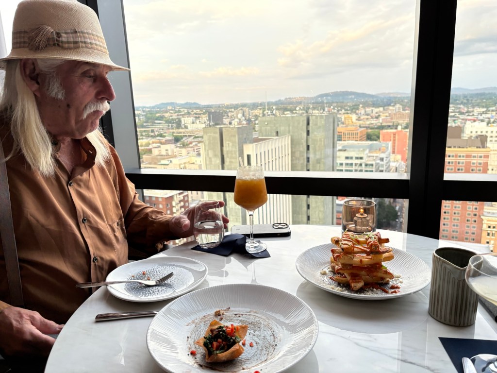 My husband had two delicious mocktails and I had a Pear With Me cocktail. Flavorful, garnished with a dried pear slice covered in sugar. I decided to eat the candied pear as a first course rather than sweeten my drink. It was crisp like candy apple. I sipped the complex mixture as we enjoyed the snack selection. Intense flavors paired well and peared well… A delicious treat with a stunning view.